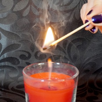 Kerze aus. - Halten Sie das brennende Streichholz ein paar Zentimeter über dem Kerzendocht in die Rauchfahne. Plötzlich entzündet sich die Kerze erneut!