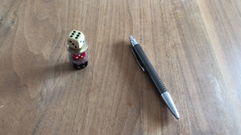 - Staple die drei Würfel und die zwei Münzen auf einer ebenen, geraden Fläche zu einem Turm. Begonnen wird mit einem Würfel, darauf liegt eine 2€-Münze, dann wieder ein Würfel, eine 2€-Münze und zum Schluss wieder ein Würfel (siehe Abb.)