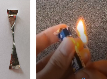 Das Kaugummipapier schließt den Stromkreis. Elektronen fließen. Da kein Verbraucher (z.B. Lampe, Motor, …) angeschlossen wurde und die Pole der Batterie direkt miteinander verbunden wurden, entsteht ein Kurzschluss.